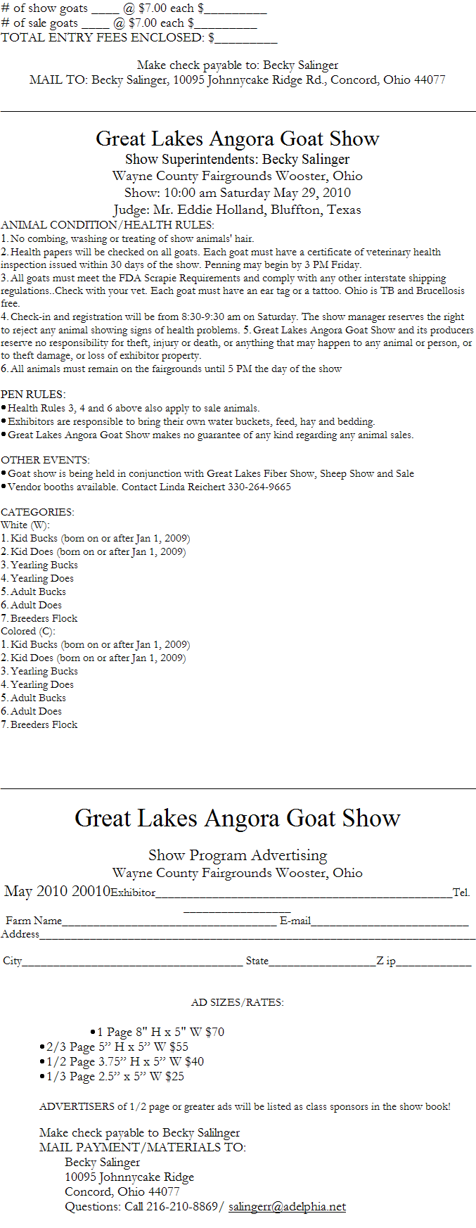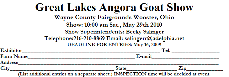2010 GREAT LAKES ANGORA GOAT SHOW ENTRY FORM ![]() |